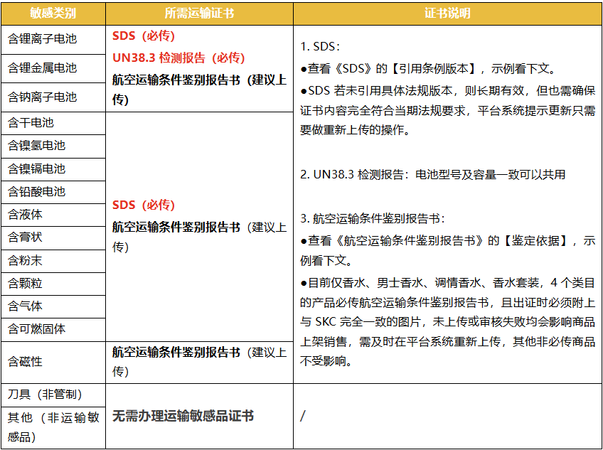 为避免包裹无法正常出关,造成包裹退回,请您务必在 2026 年 1 月 15 日前办理新的证书,确保证书鉴定依据为 IATA DGR 67th 版本并上传系统。注意,未及时更新《SDS》证书的商品将面临下架处罚;《航空运输条件鉴别报告书》仅对部分商品(香水)售卖有影响,详见下文证书说明。